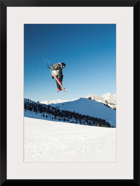 <p>A View Of A Freestyler Flying With His Skis After A Jump In Val Gardena, Bolzano Province, South Tyrol, Trentino Alto Adige, Italy</p>