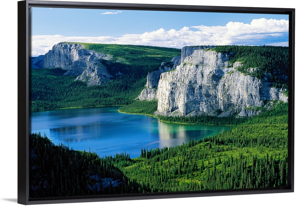 <p>Photograph taken of immense cliffs known as Death Lake. The land is blanketed with trees and the lake sits in the center of the picture.</p>