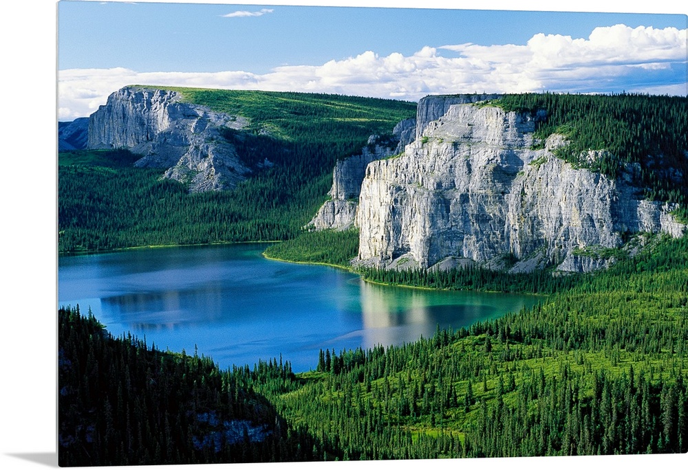 <p>Photograph taken of immense cliffs known as Death Lake. The land is blanketed with trees and the lake sits in the center of the picture.</p>
