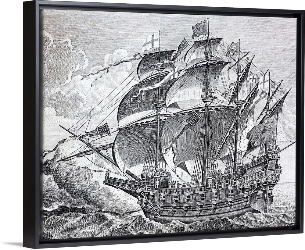 <p>A view of Henry Grace a Dieu, popularly known as The Great Harry, an English four-masted carrack or man of war, the largest type of fighting sailing ship of the 16th century. She had a displacement of over 1000 tons and would have had a crew of about 700 to 1000 men. Originally built at Woolwich Dockyard from 1512 to 1514 in the reign of Henry VIII. but later modified and updated. 18th century engraving. The Great Harry took part in the Battle of the Solent in 1545, in which the Mary Rose sank.</p>