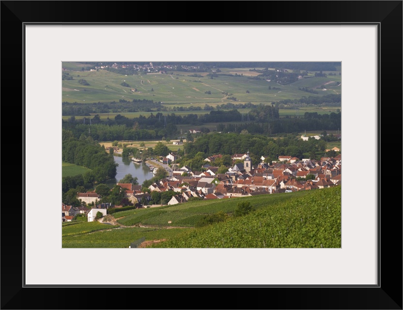<p>A view of the Vallee de la Marne river and vineyards and the village Cumieres , the village of Hautvillers in Vallee de la Marne , Champagne, Marne, Ardennes, France</p>