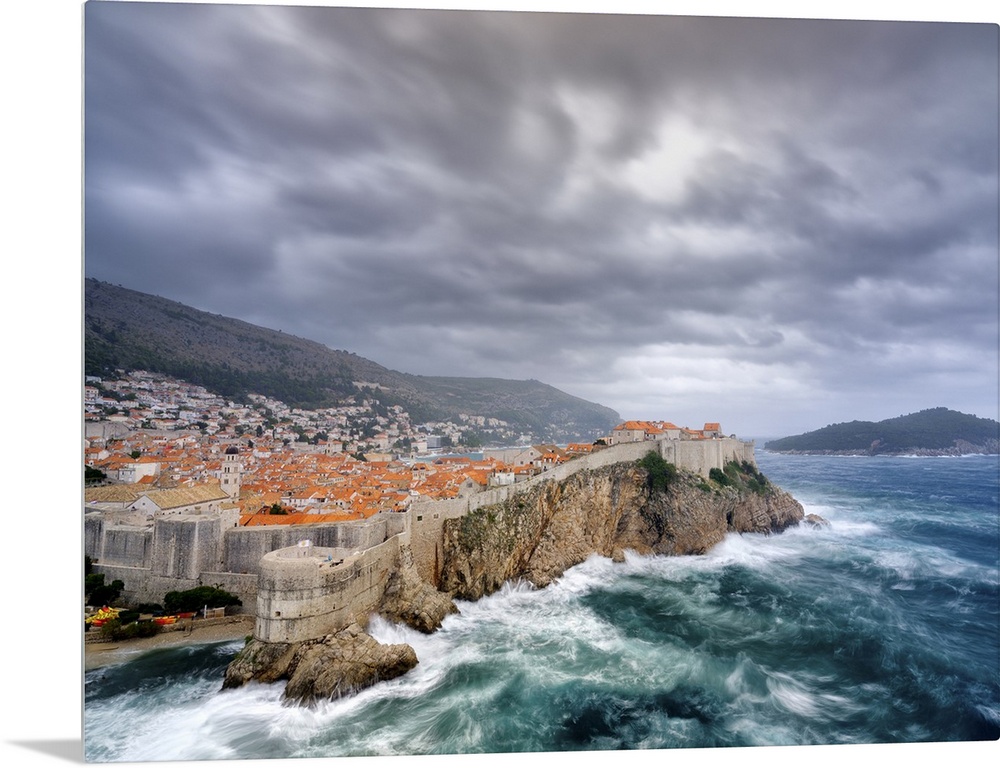 <p>A view towards Dubrovnik Old Town with stormy seas below the city walls.</p>