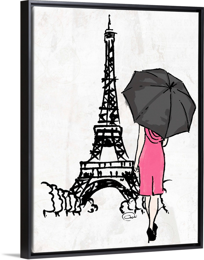 <p>Artwork of a woman in a pink dress under a black umbrella walking toward a famous Parisian monument, against a white background.</p>