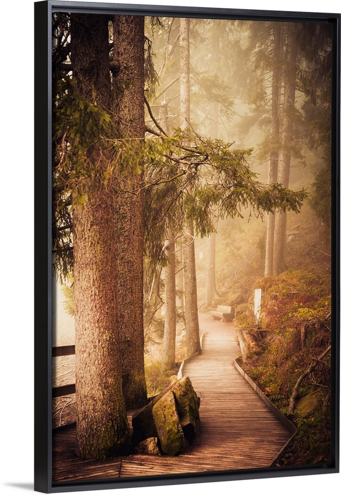 <p>Wooden path in a misty forest</p>
