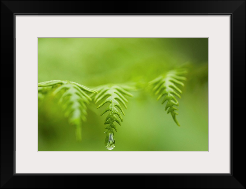 <p>A waterdrop hangs on the edge of a fern frond. Manzanita, Oregon, United States of America.</p>
