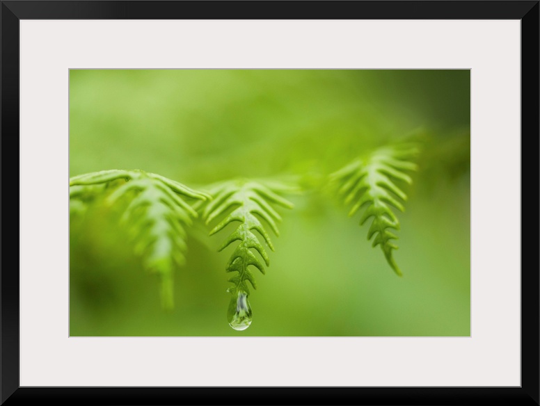 <p>A waterdrop hangs on the edge of a fern frond. Manzanita, Oregon, United States of America.</p>