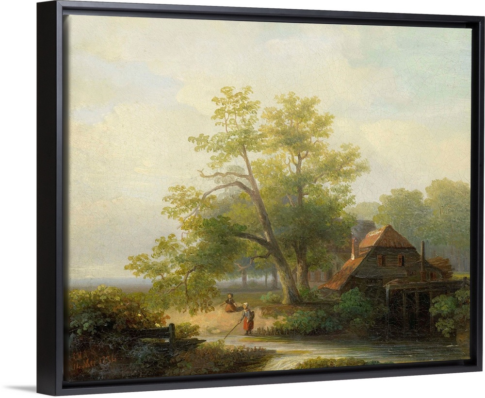 <p>A Watermill in a Woody Landscape, by Lodewijk Hendrik Arends, 1854, Dutch oil painting on panel. One girl fishes in the stream as another sits nearby.</p>