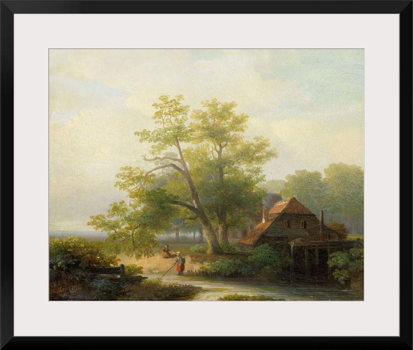<p>A Watermill in a Woody Landscape, by Lodewijk Hendrik Arends, 1854, Dutch oil painting on panel. One girl fishes in the stream as another sits nearby.</p>