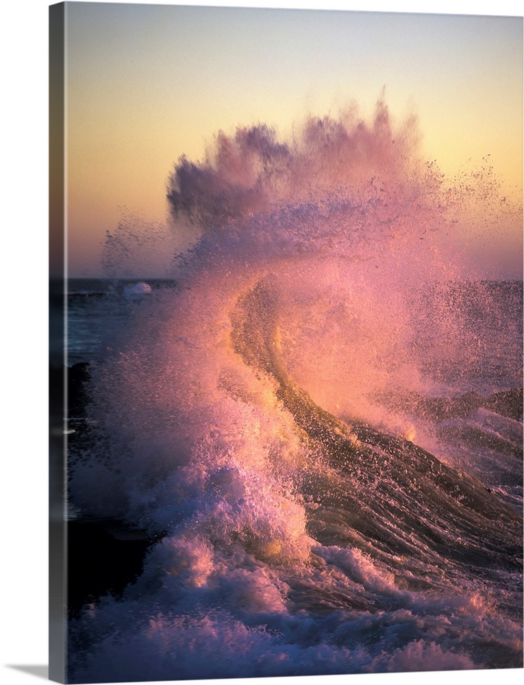 <p>A wave glowing pink breaks on the shore at sunset. Yachats, Oregon, United States of America.</p>