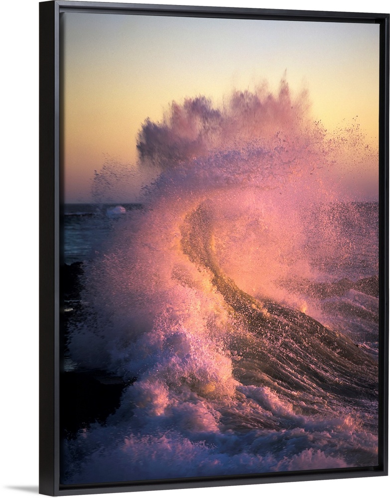 <p>A wave glowing pink breaks on the shore at sunset. Yachats, Oregon, United States of America.</p>