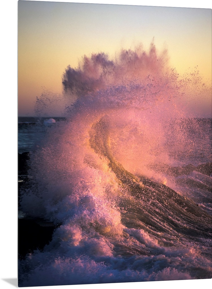 <p>A wave glowing pink breaks on the shore at sunset. Yachats, Oregon, United States of America.</p>