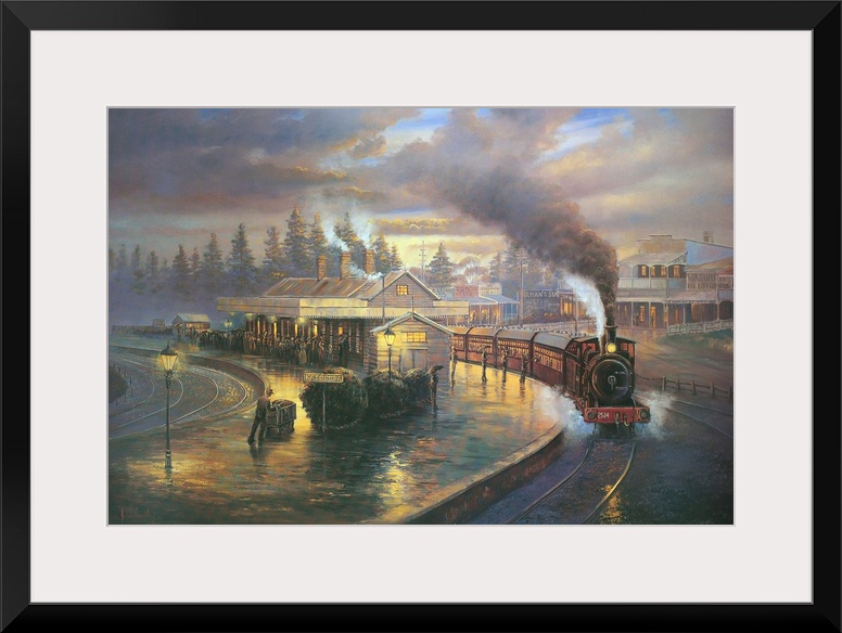 <p>Contemporary painting of a train pulling into the station at night.</p>