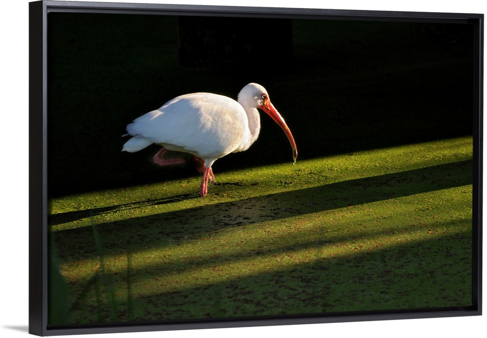 <p>A white ibis hunts for food in shallow duckweed-covered water.</p>