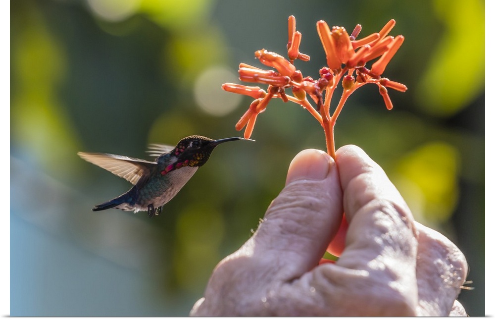 <p>A wild adult male bee hummingbird, attracted to hand-held flower near Playa Larga, Cuba, West Indies, Caribbean</p>