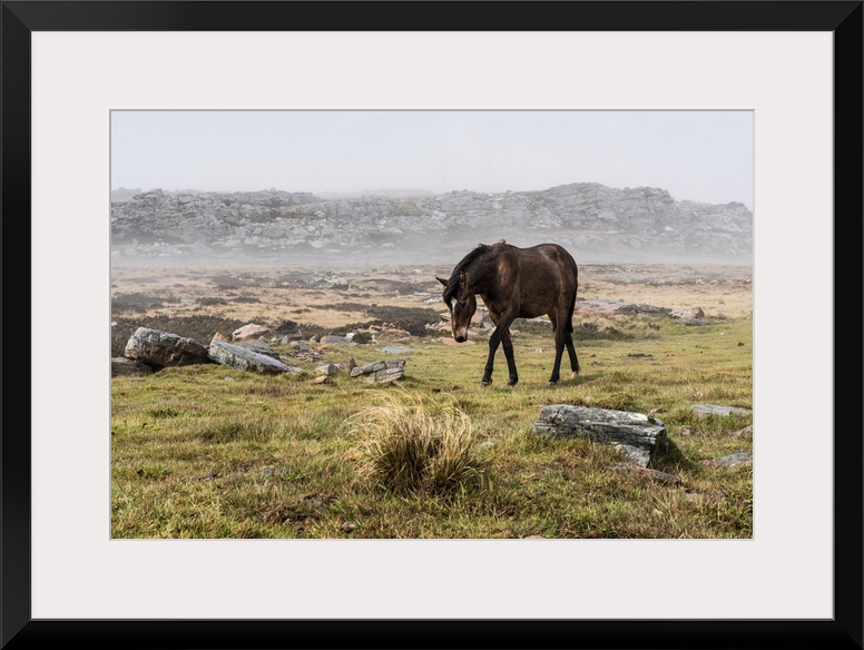 <p>A wild brown horse walking in a foggy field.</p>