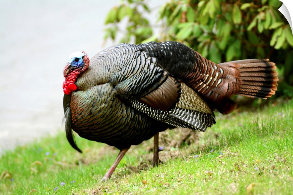 <p>A wild turkey, Meleagris gallopavo, struts down a hill.</p>