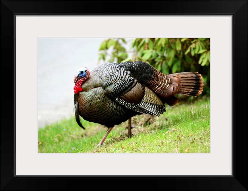 <p>A wild turkey, Meleagris gallopavo, struts down a hill.</p>