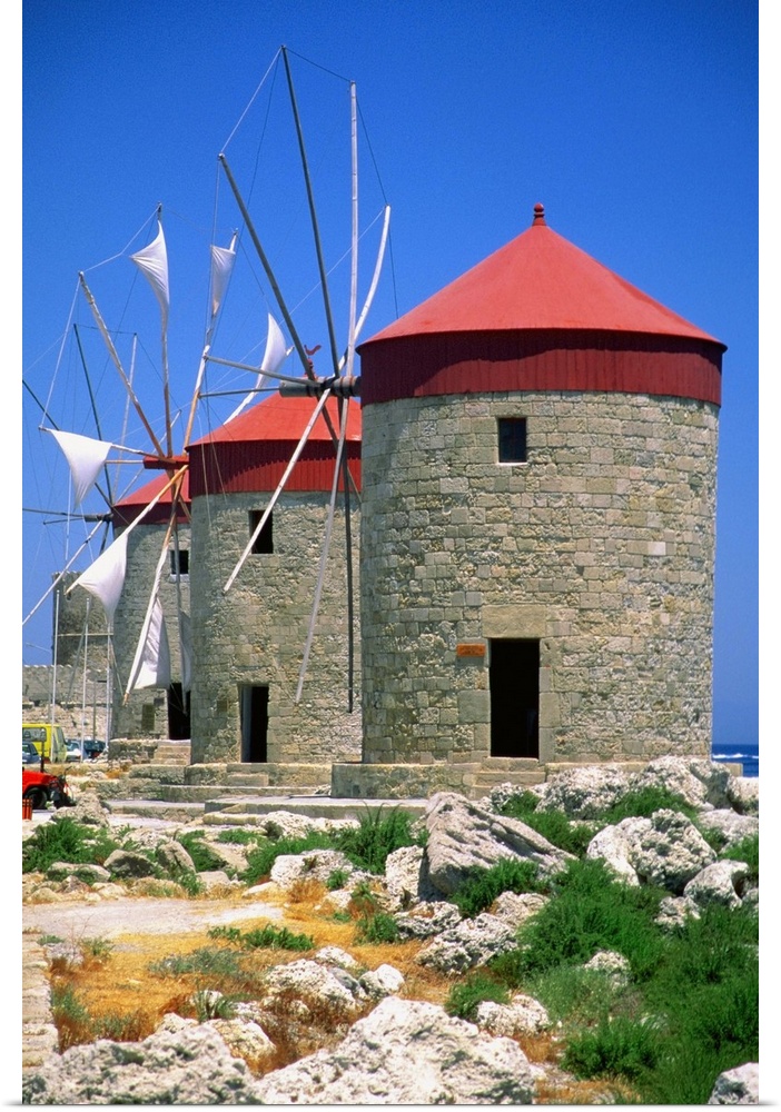 <p>Low angle view of a windmill at Mandraki Harbor, Rhodes, Greece</p>