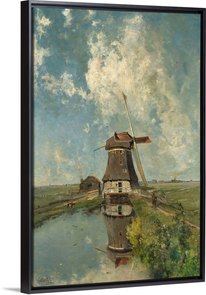<p>A Windmill on a Polder Waterway, known as "In the Month of July", by Paul Gabriel, c. 1889, Dutch painting, oil on canvas. Gabriel painted this summer landscape with bright, saturated color.</p>