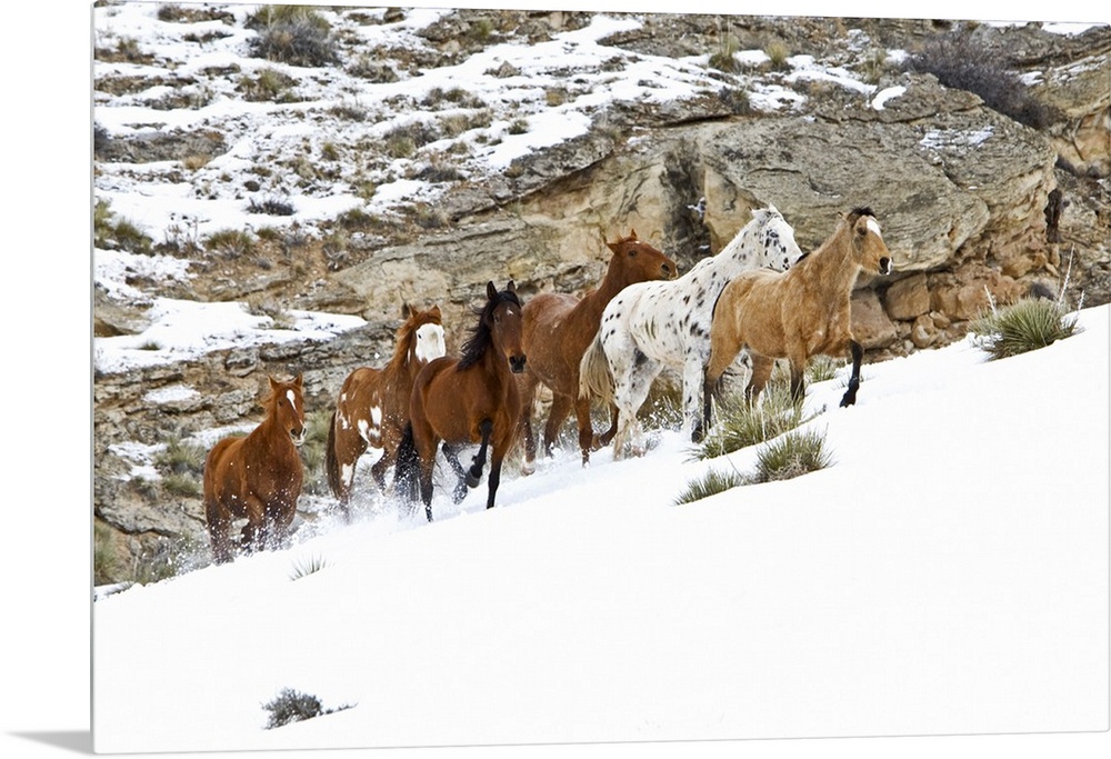 <p>A winter scene of running horses on The Hideout Ranch in Shell, Wyoming.</p>