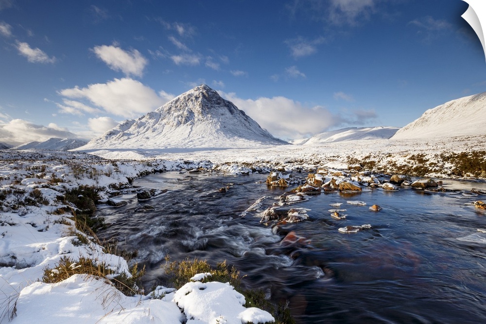 <p>A wintery scene at Buachaille Etive Mor and River Coupall, Glencoe, Highlands, Scotland, United Kingdom, Europe</p>