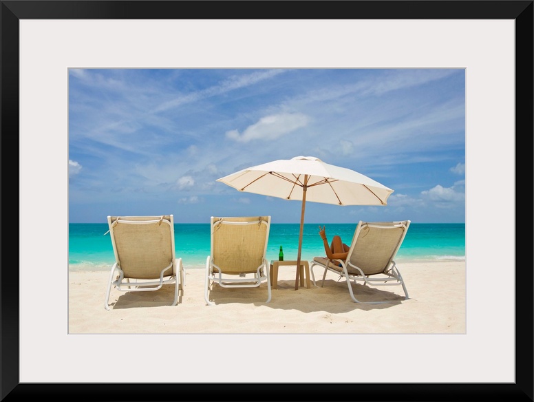 <p>A woman in a beach chair under an umbrella giving the Peace sign.</p>