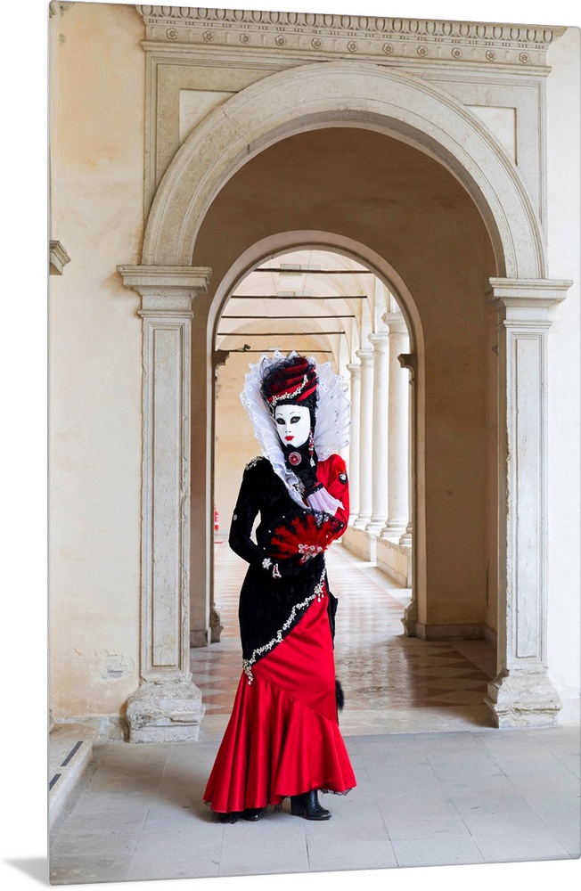 <p>A Woman In A Red Costume And Mask Poses In An Archway During The Venice Carnival, Venice, Italy</p>