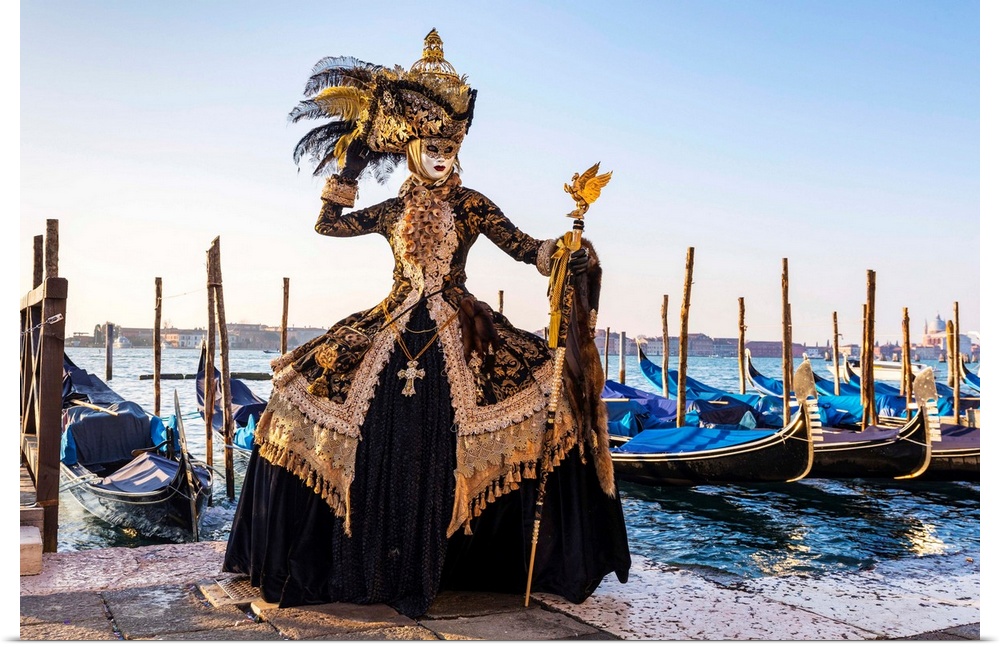 <p>A Woman In A Magnificent Costume Poses In Front Of Gondolas During The Venice Carnival, Venice Lagoon, St. Mark's Square, Venice, Italy</p>