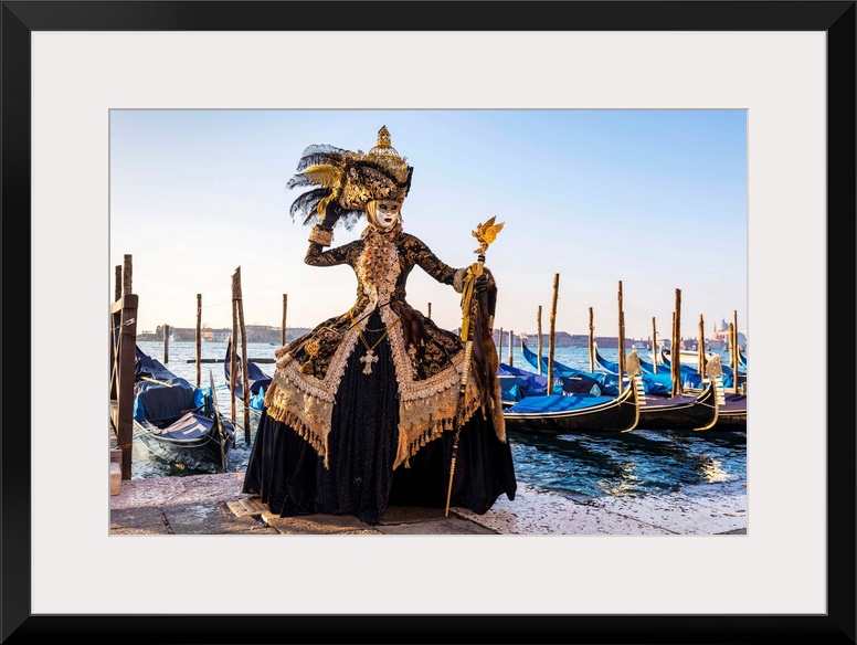 <p>A Woman In A Magnificent Costume Poses In Front Of Gondolas During The Venice Carnival, Venice Lagoon, St. Mark's Square, Venice, Italy</p>