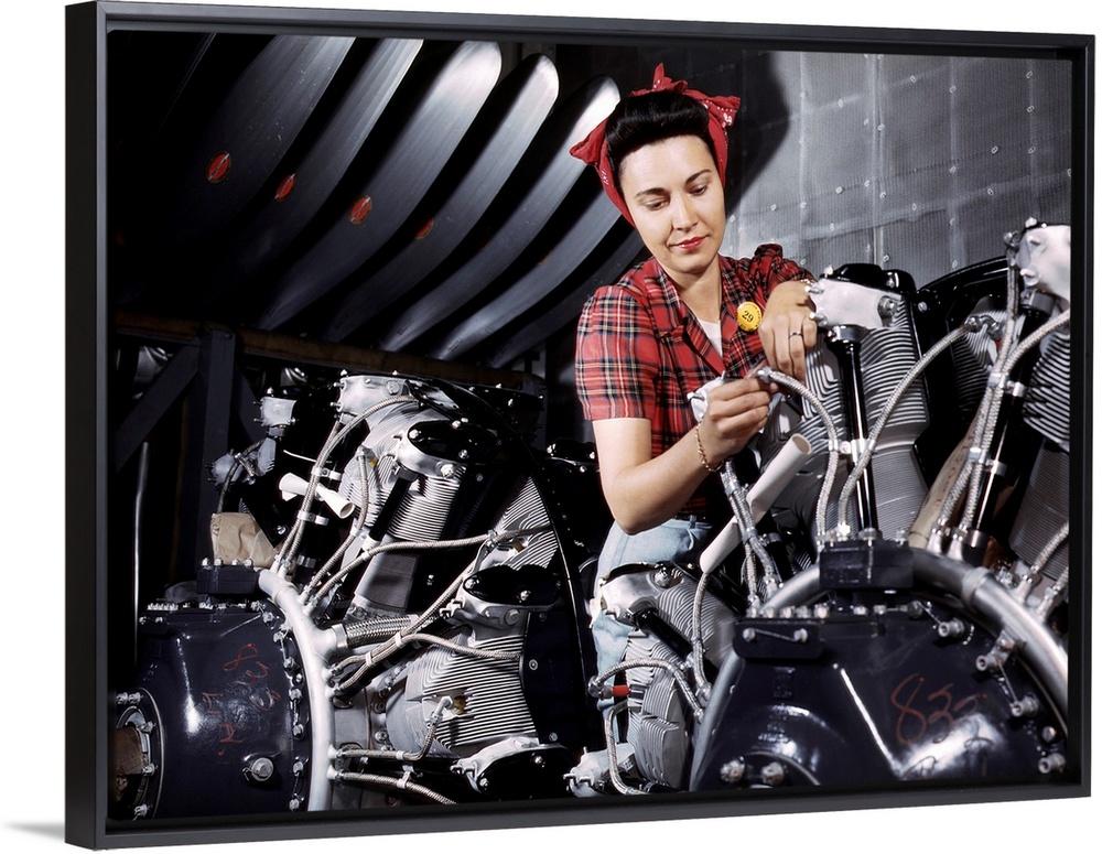 <p>A woman working on an airplane motor at the North American Aviation plant in California. Photograph by Alfred T. Palmer, June 1942.</p>