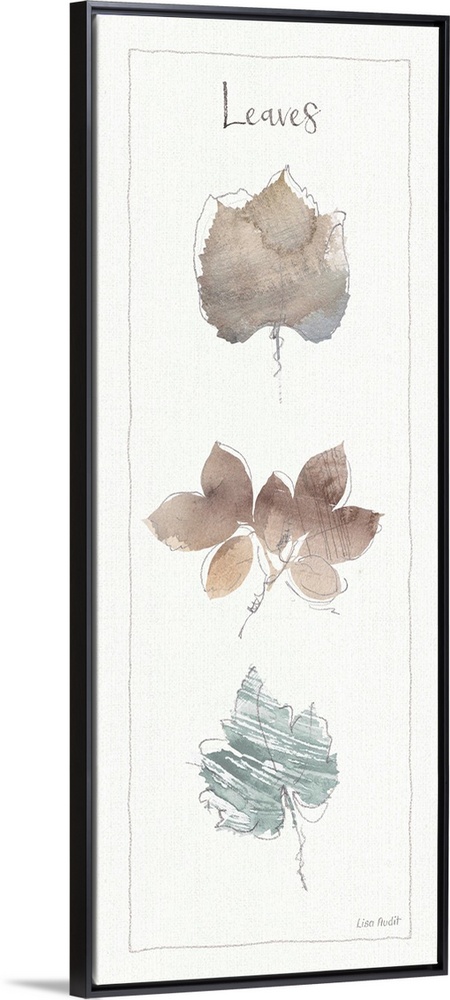 <p>Watercolor painting of a variety of types of leaves on an off white background with a thin line border and the word "Leaves."</p>