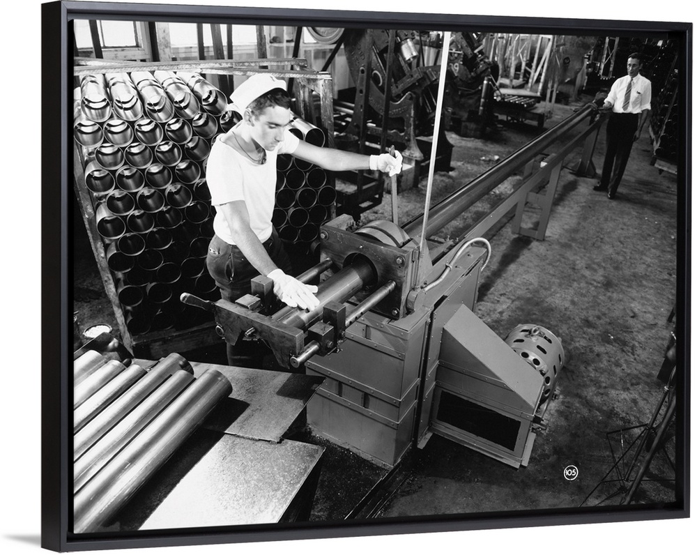 <p>A worker at a tube cutting machine in a factory in Louisville, Kentucky. Photograph, 1945.</p>