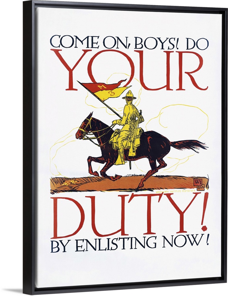 <p>U.S. military history print of an American soldier on horseback jumping over an obstacle and carrying a flag along with the words; Come On Boys! Do Your Duty! By Enlisting Now! The print is a part of a recruiting and enlistment drive launched in the U.S. during the First World War to inspire youngsters to enlist into the armed forces. Print created by Vojtech Preissig, 1917.</p>
