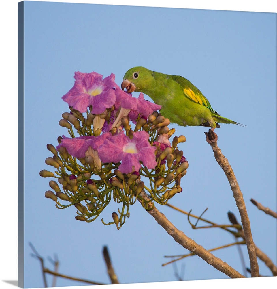 <p>South America. Brazil. A yellow-chevroned parakeet (Brotogeris chiriri) harvesting the blossoms of a pink trumpet tree (Tabebuia impetiginosa) in the Pantanal, the world's largest tropical wetland area, and a UNESCO World Heritage Site.</p>