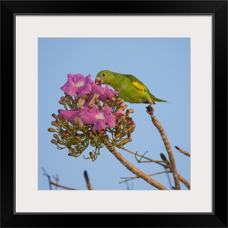 <p>South America. Brazil. A yellow-chevroned parakeet (Brotogeris chiriri) harvesting the blossoms of a pink trumpet tree (Tabebuia impetiginosa) in the Pantanal, the world's largest tropical wetland area, and a UNESCO World Heritage Site.</p>