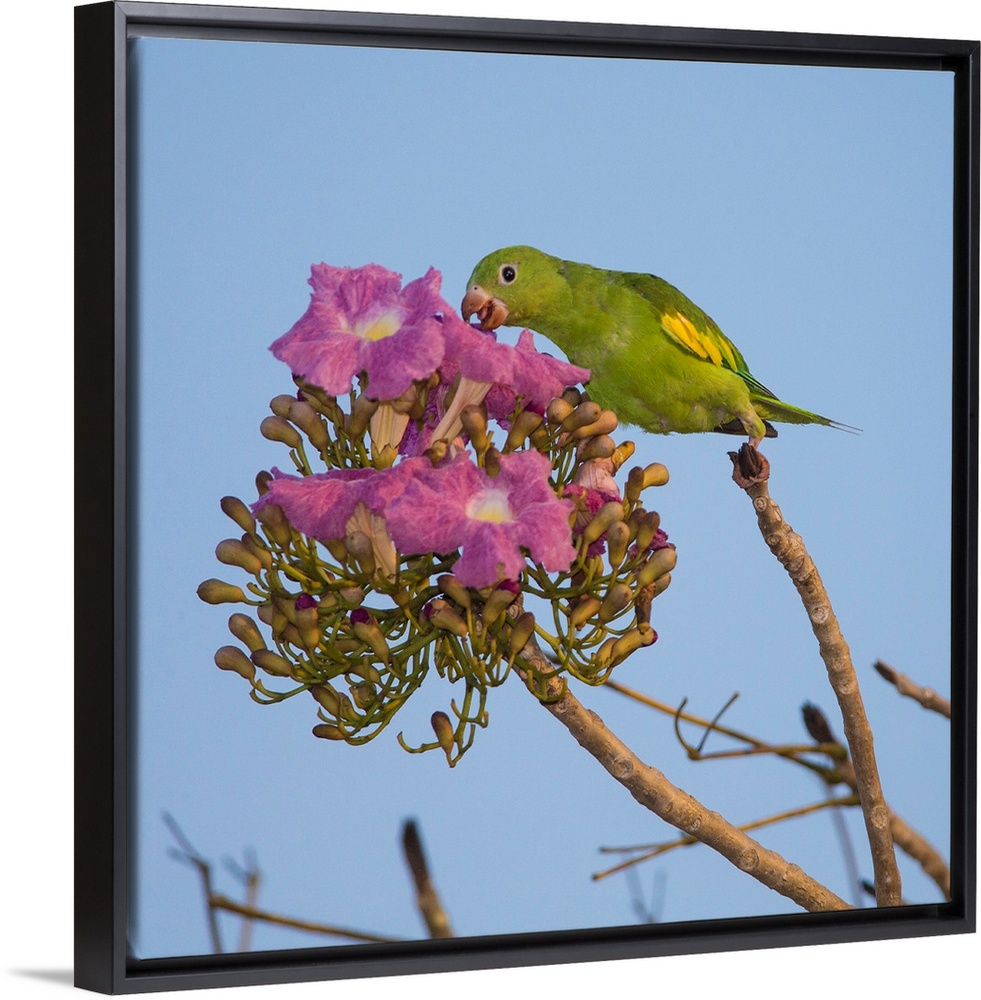 <p>South America. Brazil. A yellow-chevroned parakeet (Brotogeris chiriri) harvesting the blossoms of a pink trumpet tree (Tabebuia impetiginosa) in the Pantanal, the world's largest tropical wetland area, and a UNESCO World Heritage Site.</p>