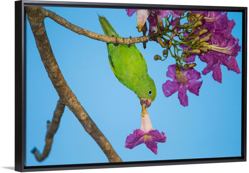 <p>South America. Brazil. A yellow-chevroned parakeet (Brotogeris chiriri) harvesting the blossoms of a pink trumpet tree (Tabebuia impetiginosa) in the Pantanal, the world's largest tropical wetland area, and a UNESCO World Heritage Site.</p>