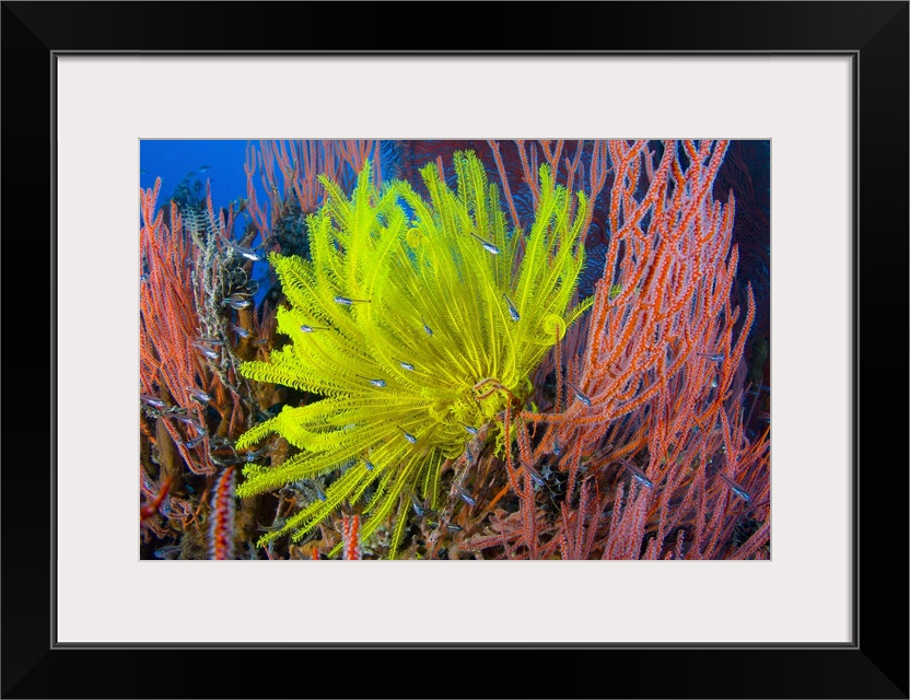 <p>A yellow crinoid feather star against red fan coral, Papua New Guinea.</p>