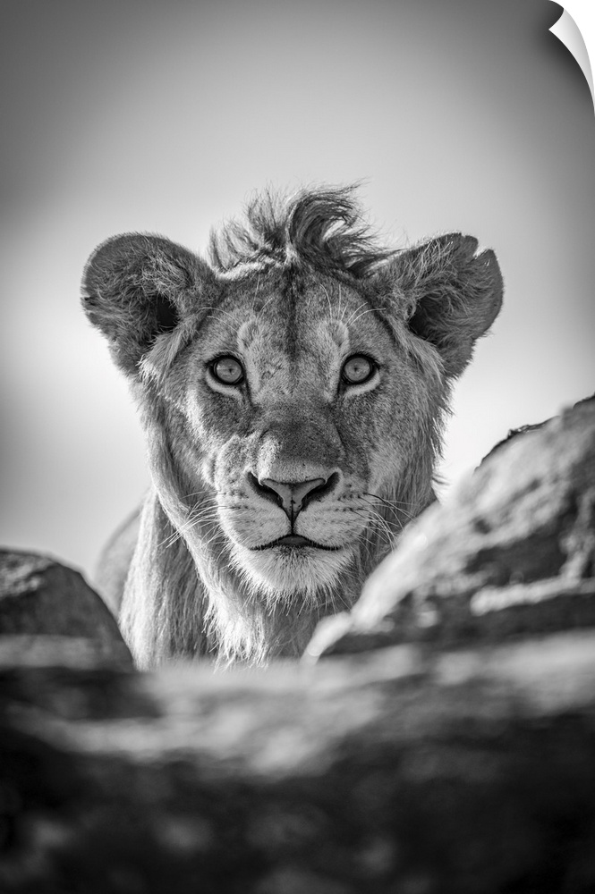 <p>A young male lion (Panthera leo) pokes his head above a rocky ledge under a blue sky. He has a short mane and is staring straight at the camera. Shot with a Nikon D850 in Serengeti National Park; Tanzania.</p>