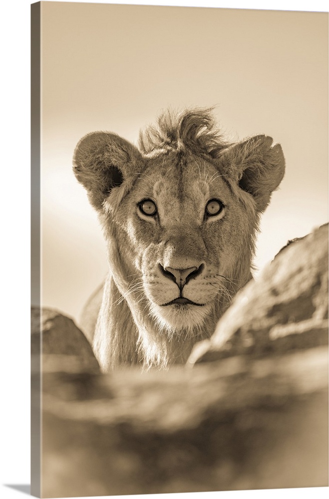 <p>A young male lion (Panthera leo) pokes his head above a rocky ledge. He has a short mane and is staring straight at the camera, Serengeti National Park; Tanzania</p>