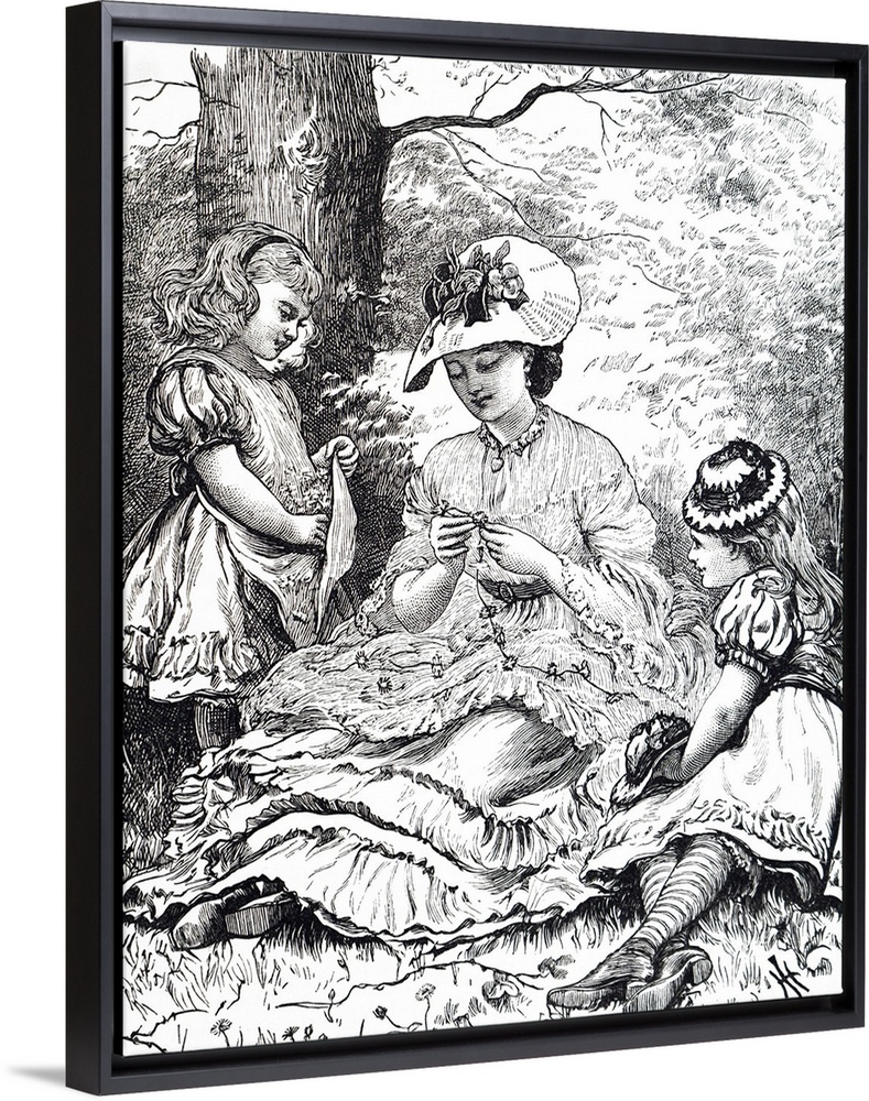 <p>Illustration depicting a young mother teaching her two young daughters to make daisy chains. Dated 19th century.</p>