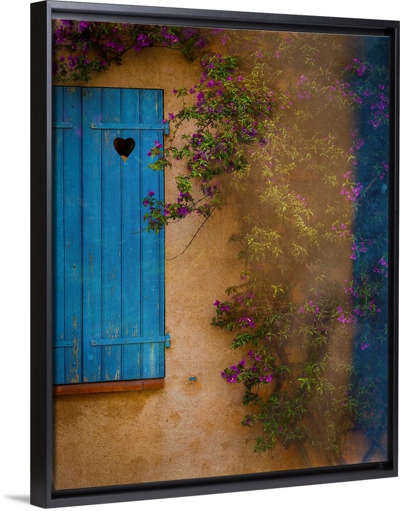 <p>Photograph of a French facade with a window and blue wooden shutters framed by a vine with little purple flowers.</p>