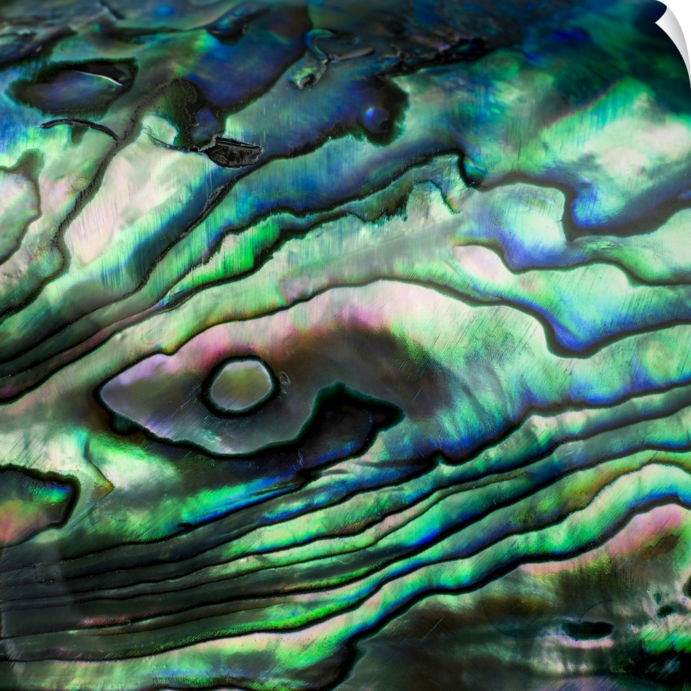 <p>Underside of the shell of an abalone (Haliotis sp.) sea-snail, showing the iridescent nacre lining. Abalone are large edible marine molluscs. Nacre is an iridescent shell lining produced by some mollusks. It is composed of the same material that makes up pearls and is commonly used in the jewellery industry.</p>