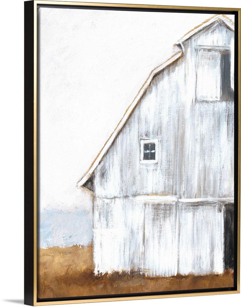 <p>Horizontal brush strokes and a soft amber landscape form to make a cropped image of a white worn barn resting in the country.</p>