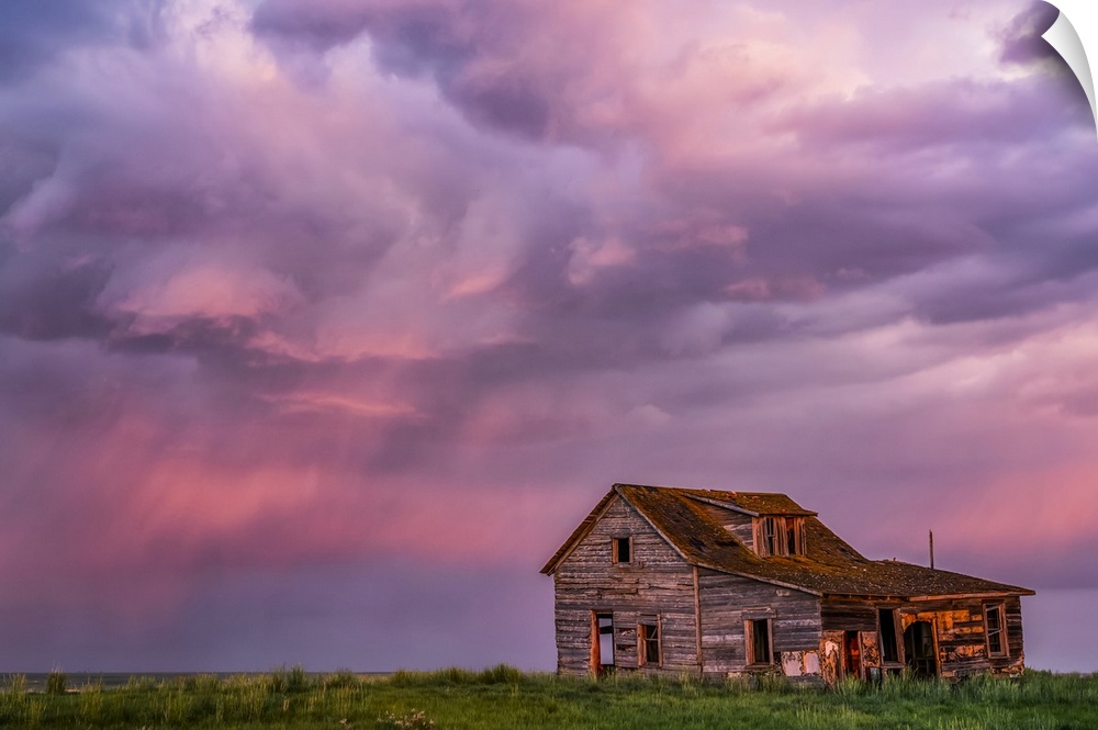 <p>Abandoned barn on farmland with storm clouds glowing pink; Val Marie, Saskatchewan, Canada</p>