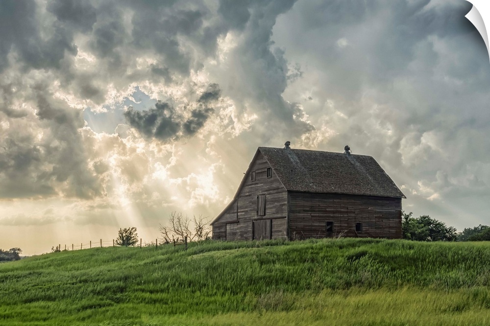 <p>Abandoned barn with storm clouds converging overhead; Nebraska, United States of America</p>
