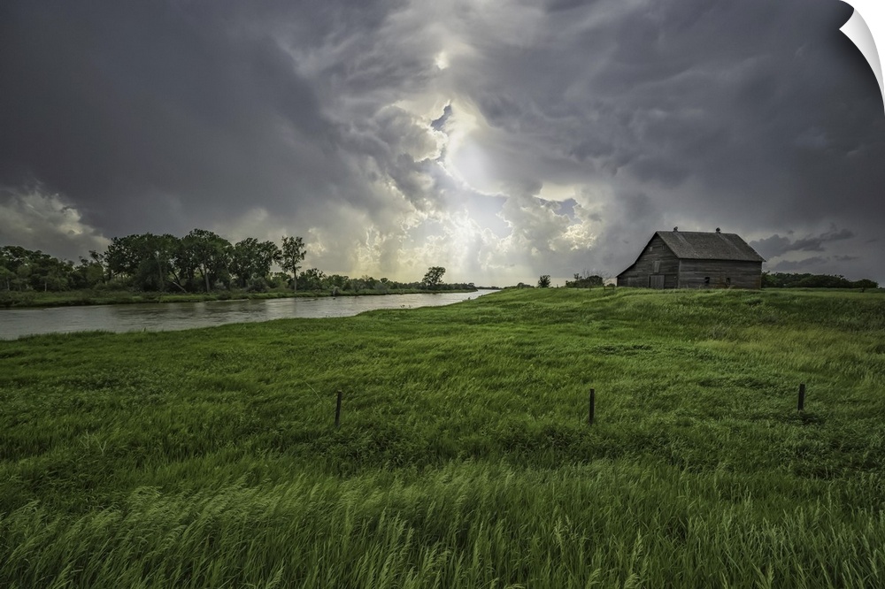 <p>Abandoned barn with storm clouds converging overhead, Nebraska, united states of America.</p>