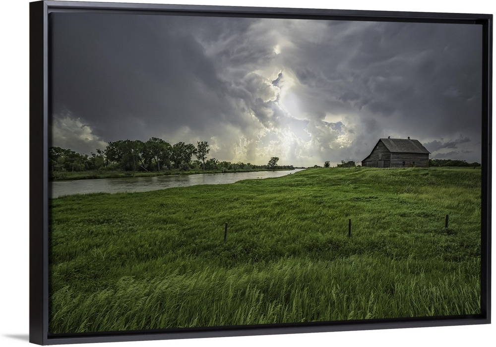 <p>Abandoned barn with storm clouds converging overhead, Nebraska, united states of America.</p>