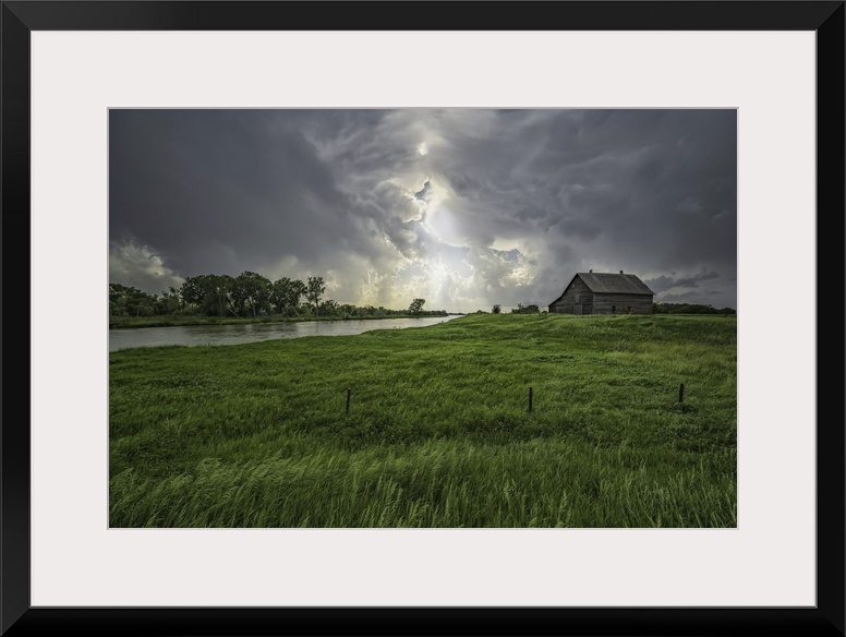 <p>Abandoned barn with storm clouds converging overhead, Nebraska, united states of America.</p>