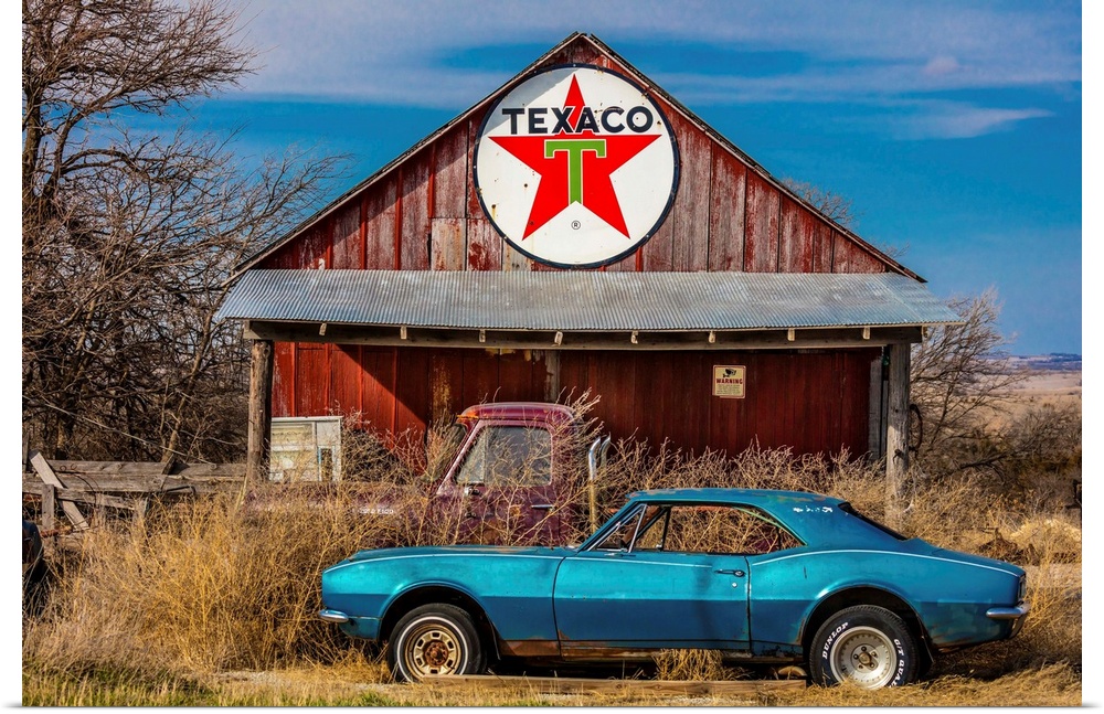 <p>Abandoned blue camaro chevrolet in front of deserted texaco station, remote part of nebraska.</p>